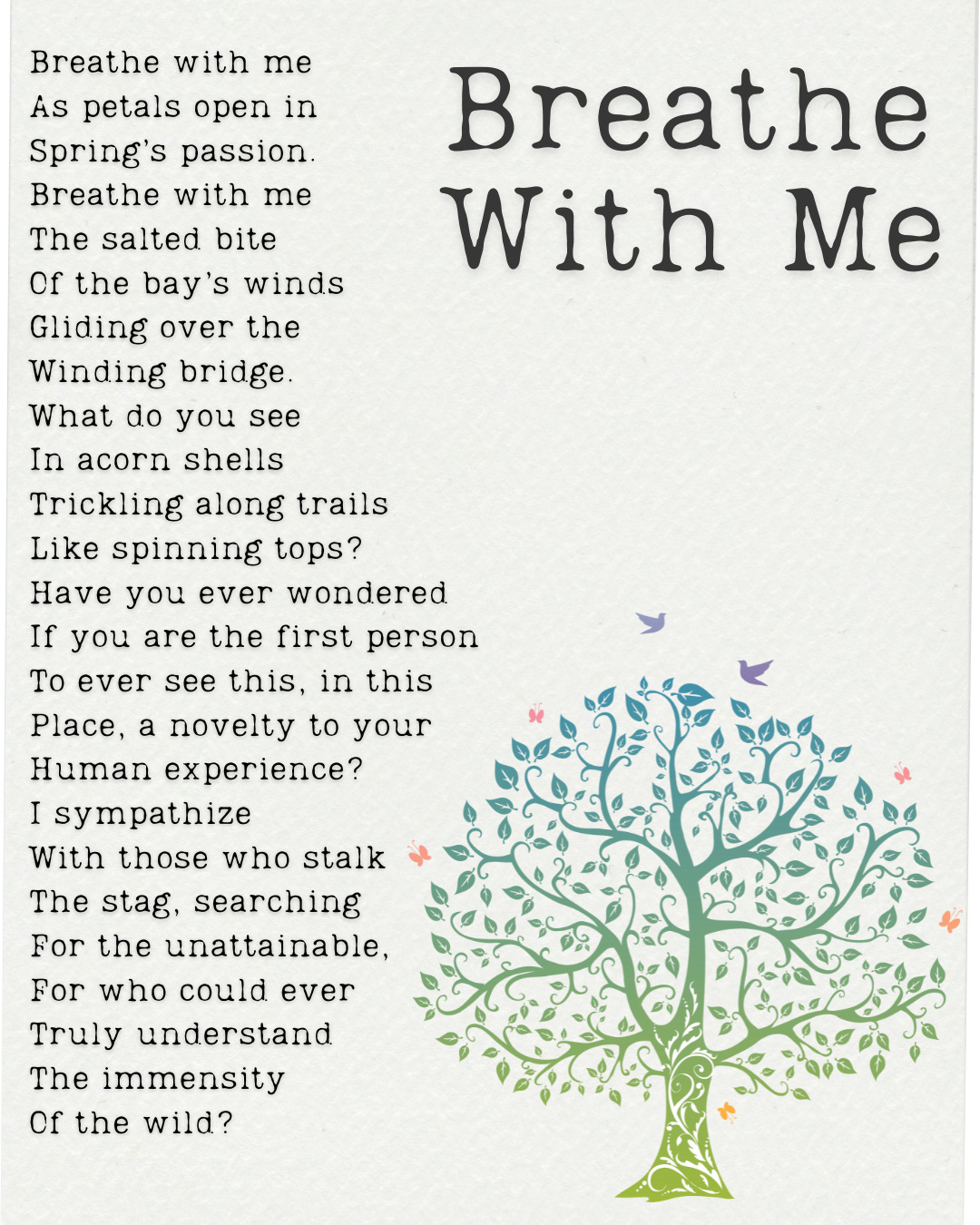 Breathe with me As petals open in Spring’s passion. Breathe with me The salted bite Of the bay’s winds Gliding over the Winding bridge. What do you see In acorn shells Trickling along trails Like spinning tops? Have you ever wondered If you are the only person To ever see this, in this Place, a novelty to your Human experience? I sympathize With those who stalk The stag, searching For the unattainable, For who could ever Truly understand The immensity Of the wild?